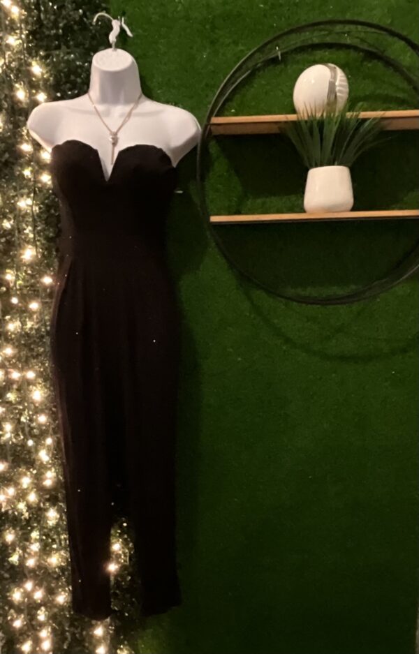 Juimsuit color Negro. Strech con zipper en la parte de atras, la tela tiene brillito y en el area del busto tiene goma (para fijar la pieza) que no se baje.